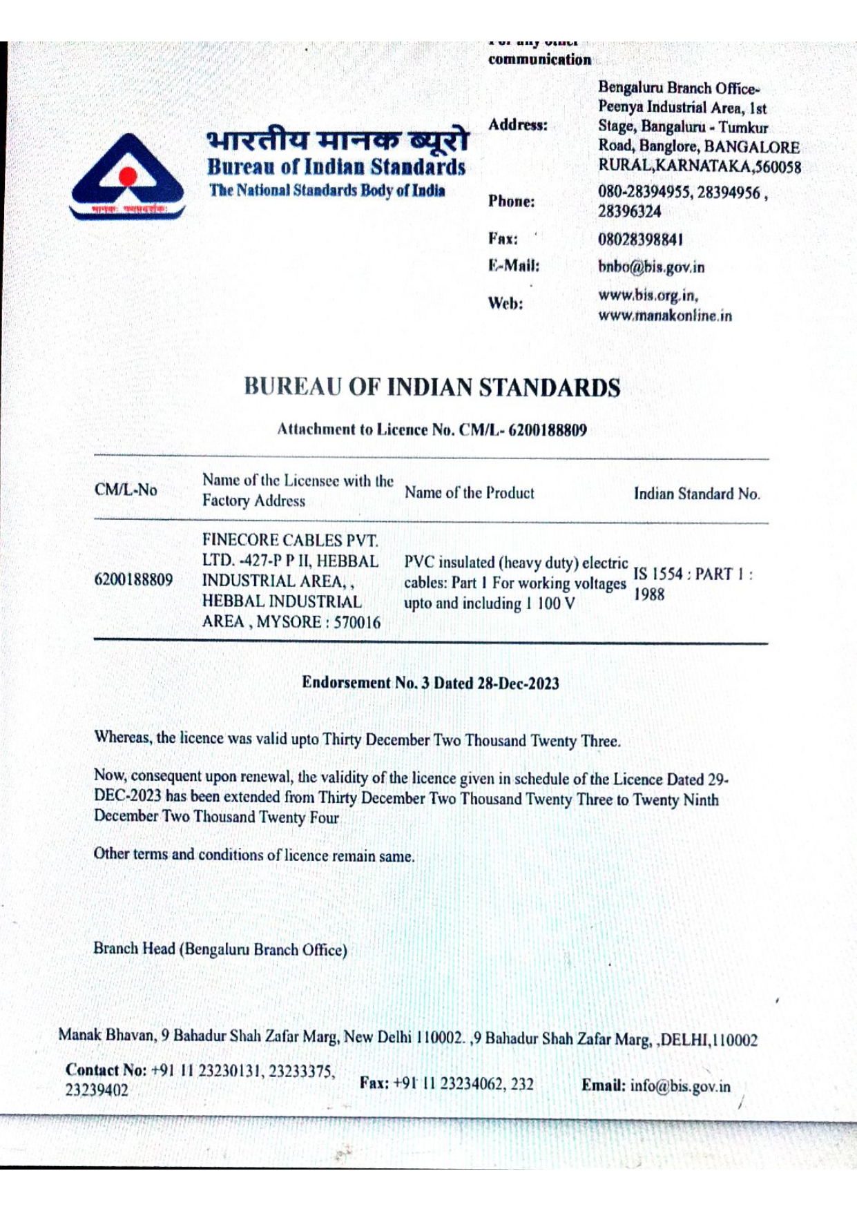 FineCore Cables Pvt. Ltd. proudly holds the BIS certification (CML No. 6200188809)This certification highlights our dedication to safety, quality, and adherence to national standards.